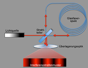 Prinzipbild eines Glasfaser-Ringinterferometers ("Faserkreisel") |
